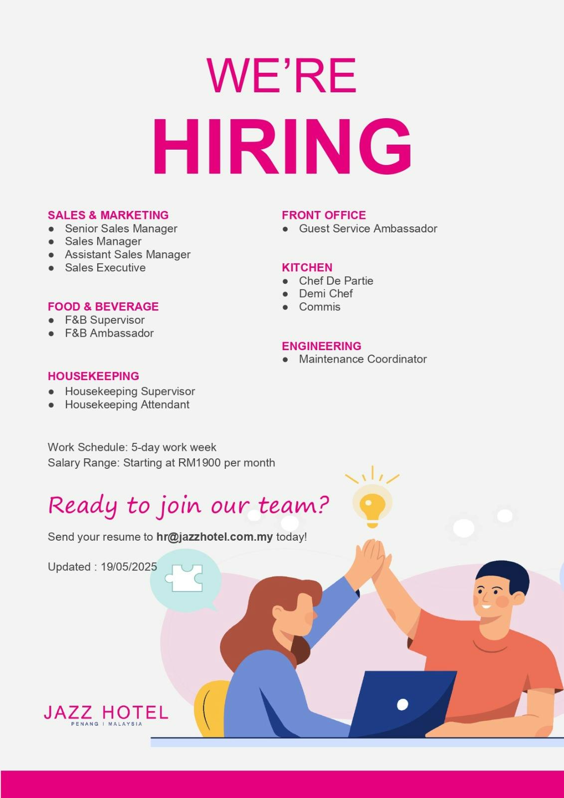 For more information about job opportunities at Jazz Hotel Penang, please see the vacancies below.