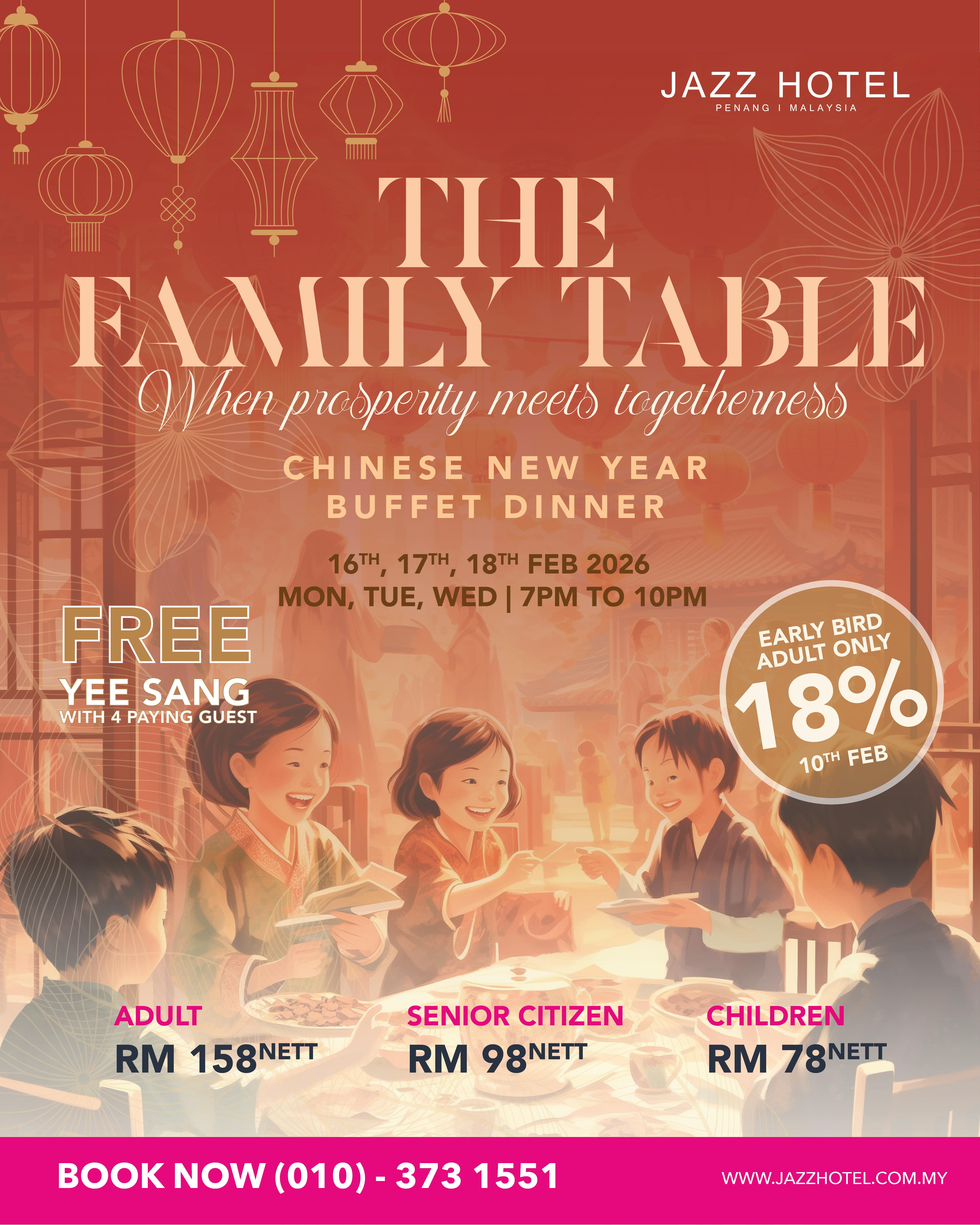 Gather with loved ones this Chinese New Year and celebrate the joy of togetherness at The Family Table. Indulge in a festive buffet thoughtfully prepared to honour tradition, prosperity, and shared moments, set in a warm and welcoming atmosphere at Jazz Hotel Penang. From classic favourites to celebratory highlights, it’s an evening where prosperity truly meets togetherness.