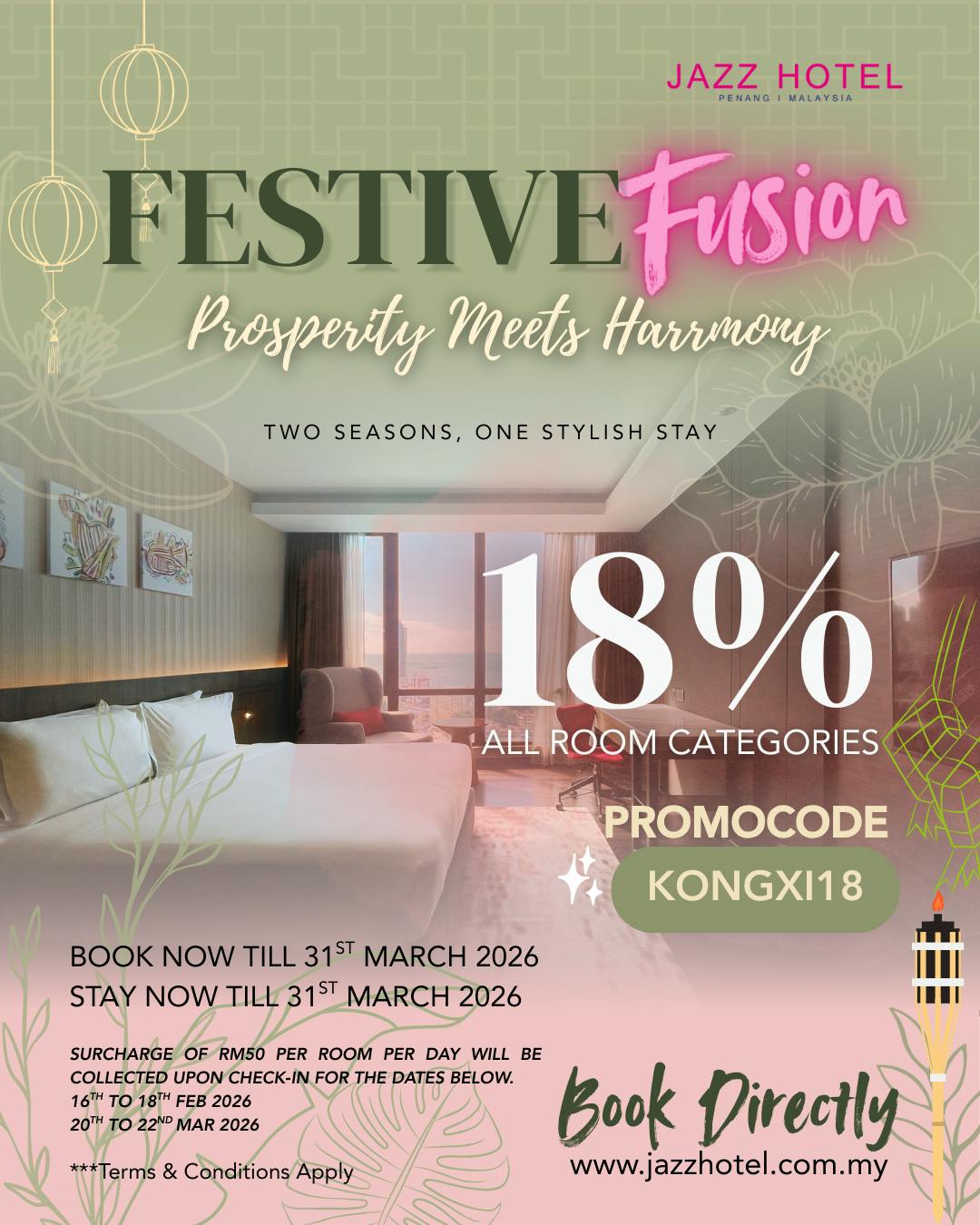Enjoy a seamless celebration across two seasons with Festive Fusion, our exclusive room offer designed to bring together the joy of Chinese New Year and the serenity of Ramadan. From festive cheer to peaceful retreat, indulge in a stylish stay where comfort, harmony, and celebration come together at Jazz Hotel Penang.