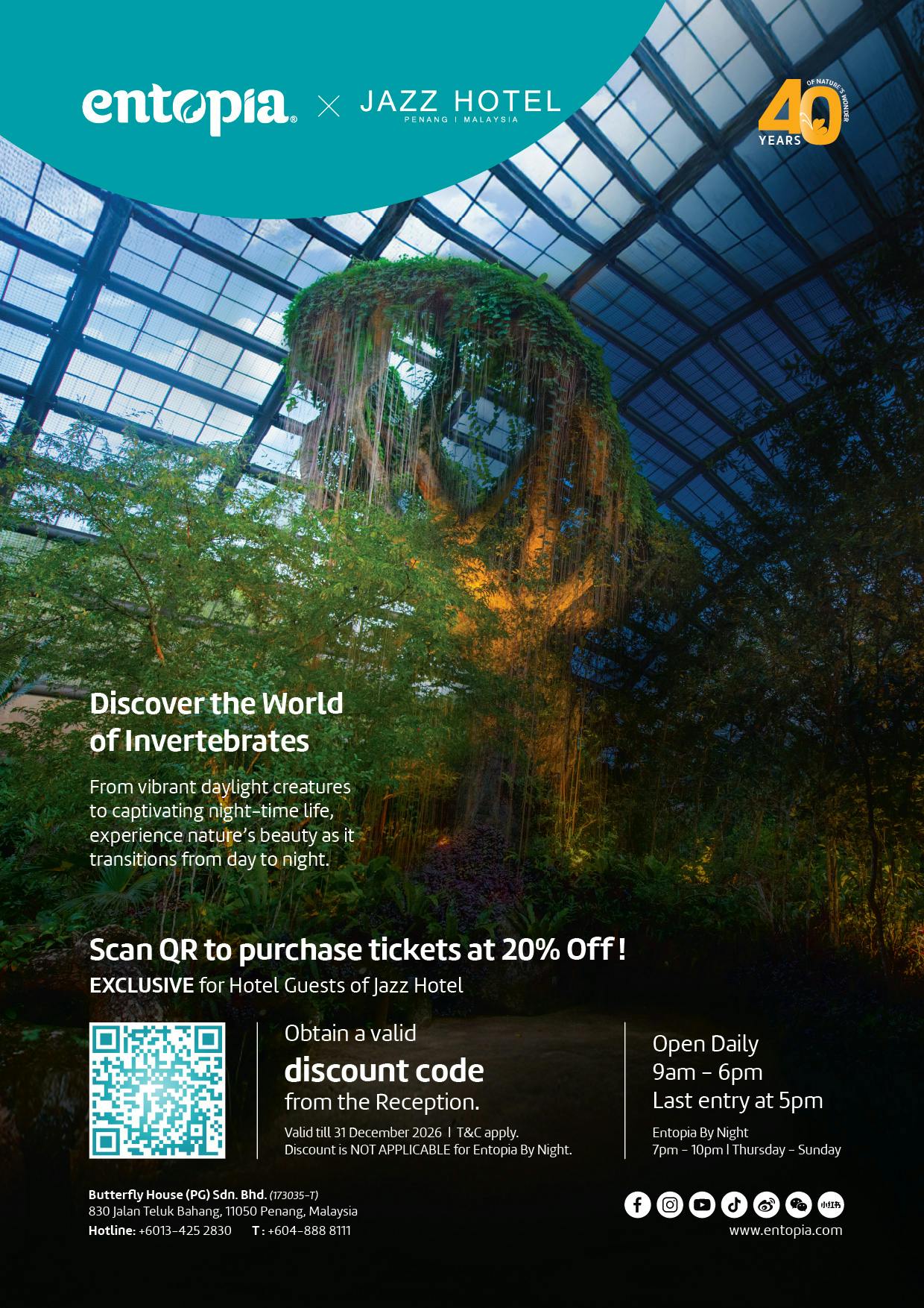 Exclusive for Jazz Hotel in-house guests! Enjoy 20% off at Entopia by Penang Butterfly Farm.